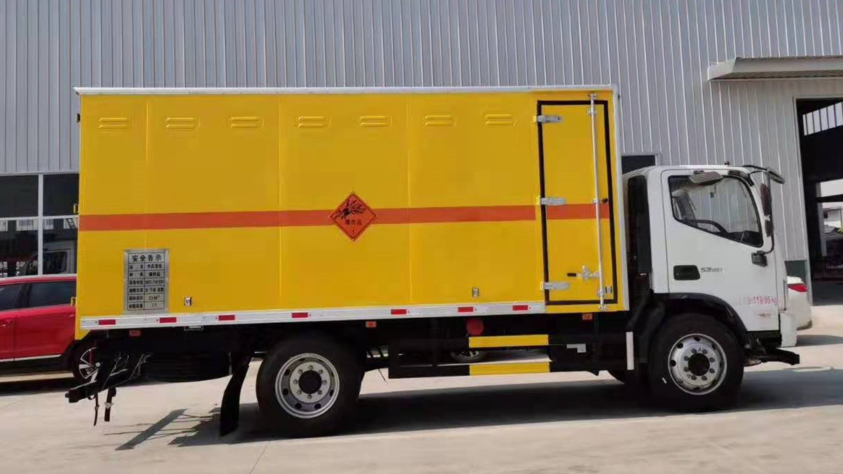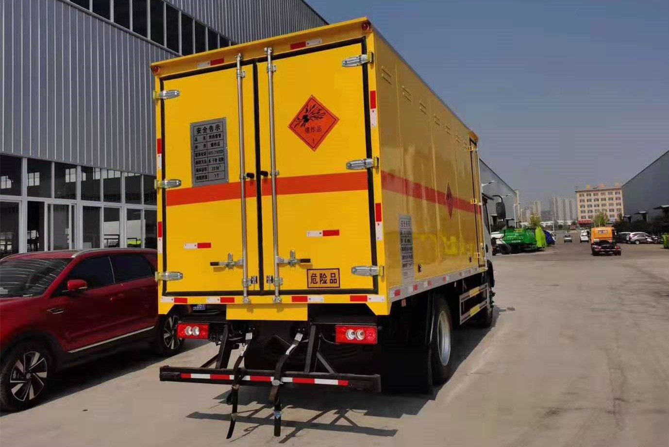 該車適用于運輸危險品,隨底盤選裝駕駛室,選裝右側不開門;危險貨物運輸車輛的類型(EX/Ⅲ),廂體頂部封閉,不可開啟,運送爆炸品的品名:黑火藥,壓縮黑火藥,電(非電)引爆雷管,爆破炸藥,導爆索,點燃導火索;運送爆炸品的項號:1.1D,1.1D,1.1B,1.1D;安全裝置為導靜電帶,用于防止靜電;僅采用底盤子午線輪胎和帶ABS的底盤,該車前輪安裝盤式制動器,前置排氣管,裝配限速裝置,限速80km/h;安裝帶有衛星定位功能的行駛記錄儀;側防護和后防護裝置材料材質為Q23**碳鋼,側防護與箱體底板和副梁焊接連接,后防護裝置與車架采用焊接連接。后防護截面尺寸(mm):120×50,離地高度為500mm。整車長度/軸距/后懸對應關系為(mm):7030/3800/2**。僅采用發動機F3.8NS6B156對應的油耗值(L/**km)為:20.81。ABS系統**器型號/生產企業:ABS-E/威伯科汽車**系統(**)有限公司,ABS-VI·E/廣州瑞立科密汽車電子股份有限公司。轉向輪裝備輪胎爆胎應急防護裝置。隨底盤選裝駕駛室。